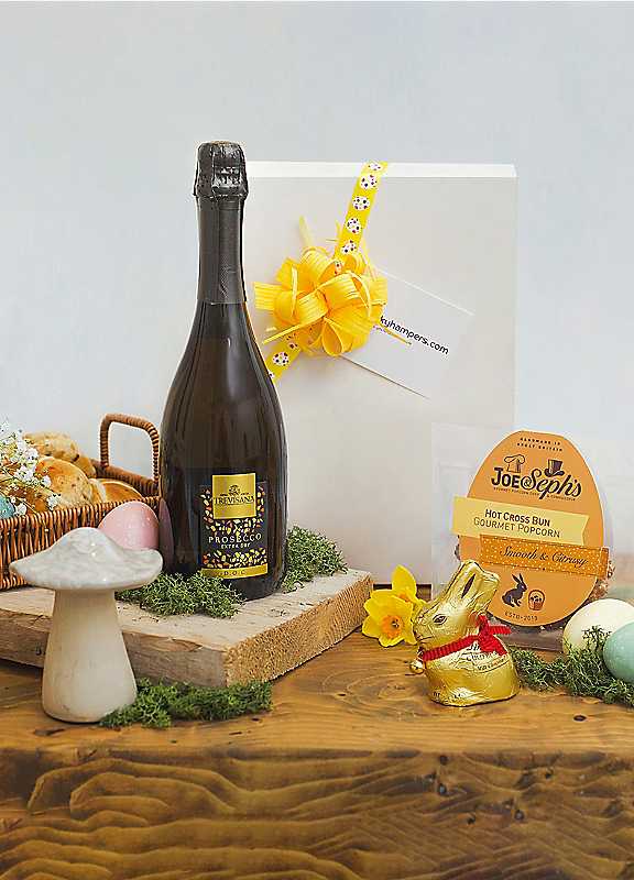 Celebrate Easter in style with this beautifully curated luxury Easter hamper. Filled with a selection of indulgent treats to make the season extra special. Perfect as a gift for family, friends, or colleagues, this hamper is a thoughtful way to spread joy and celebrate the occasion. Beautifully Presented Gift Box Includes: 75cl Bottle of Prosecco - A crisp and elegant sparkling wine, perfect for toasting the Easter weekend and enjoying with loved ones. Lindt Gold Bunny (50g) - A classic Easter favourite, made from smooth and creamy milk chocolate, wrapped in gold foil for a touch of luxury. Joe & Seph's Hot Cross Bun Flavour Popcorn - A delicious gourmet popcorn infused with the warm, spiced flavours of traditional hot cross buns, making it a unique and irresistible treat. This premium Easter gift box is carefully packaged with a decorative ribbon and gift tag, making it ideal for gifting to loved ones or as a special treat for yourself. Whether you're celebrating at home, sending a surprise to a friend, or looking for an elegant Easter gift idea, this hamper is sure to impress. Order now for a beautifully presented Easter gift that combines classic treats with a touch of luxury. Decorations not included. Age Suitability: 18+ Years 75cl Bottle of Prosecco Lindor Lindt Easter Bunny 50g Joe&Sephs Hot Cross Bun flavour popcorn Popcorn Corn, Sugar, Sultanas 25%, Butter (Milk), Glucose Syrup, Fruit 8.2% (Mixed peel (Orange Peel, Glucose-Fructose Syrup, Sugar, Lemon Peel, Acid: Citric Acid), Apple Pieces (Concentrated Apple Puree, Concentrated Lemon Puree, Glucose Syrup, Sugar, Palm Fat, Rice Starch, Acid: Citric Acid, Gelling Agent: Pectin)), Salt, Natural Apple Flavour, Cinnamon, Mixed spices. Bunny Milk chocolate Sugar, Cocoa Butter, Whole MILK Powder, Cocoa Mass, LACTOSE, Skimmed MILK Powder, Emulsifier (SOYA lecithin), BARLEY Malt Extract , Flavouring Vanillin Milk chocolate contains: Cocoa solids: 30% min., Milk solids: 14% min For ingredients information click here