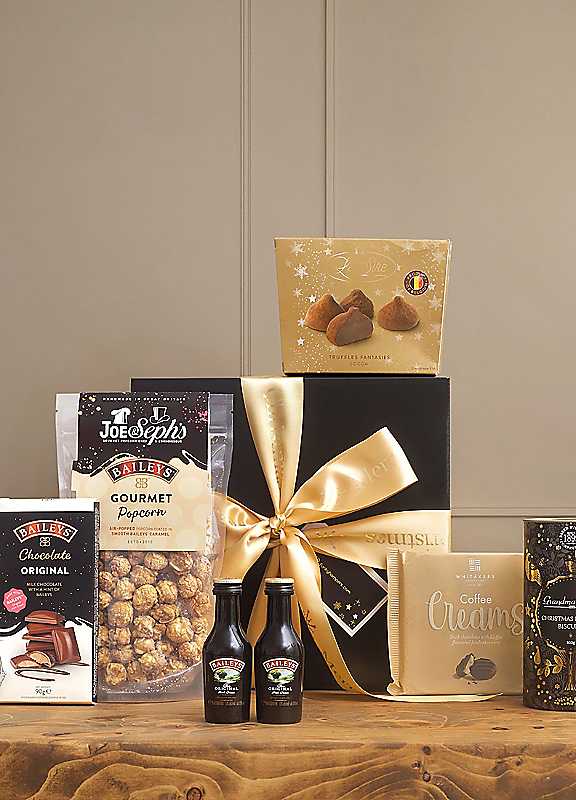 Spoil someone special this festive season with our Luxury Baileys Christmas Treats Hamper - a beautifully curated selection of sweet delights, perfectly paired with the unmistakable taste of Baileys. Whether you're gifting a friend, family member, colleague or client, this indulgent hamper is guaranteed to impress. Elegantly presented in a black gift box with gold ribbon, this festive hamper includes: 1 x Baileys Chocolate Bar (90g) - Smooth, creamy milk chocolate blended with the iconic flavour of Baileys Irish Cream. 1 x Joe & Seph's Baileys Gourmet Popcorn (80g) - Handcrafted caramel popcorn infused with rich Baileys, offering a perfect sweet crunch. 2 x Baileys Irish Cream Miniatures (50ml each) - Two mini bottles of original Baileys, ideal for sipping or pouring over desserts. 1 x Whitakers Coffee Creams - A box of classic dark chocolates with velvety coffee fondant centres - elegant and moreish. 1 x Grandma Wild's Christmas Pudding Biscuits (150g) - Traditional English biscuits with festive spices and rich Christmas pudding flavour. 1 x Box of LeSire Belgian Cocoa Dusted Truffles - Luxurious melt-in-the-mouth chocolate truffles with a dusting of fine cocoa. This is the ultimate Christmas gift for Baileys lovers, blending premium treats with festive flair. Suitable for both personal and corporate gifting, it's a go-to choice for anyone who appreciates gourmet indulgence. Why Choose This Gift? Designed for Baileys fans and chocolate lovers. Beautifully presented for a premium unboxing experience Includes gourmet popcorn, truffles, biscuits and more Ideal for Christmas delivery across the UKA festive showstopper that delivers warmth, indulgence and Baileys magic in every bite and sip. 2 x Baileys Miniatures Baileys Chocolate Bar Joe & Sephs Baileys Popcorn Whitakers Coffee Creams LeSire Coca truffles 5Grandma Wilds Christmas Pudding Biscuits 18 Years & Over Drink Responsibly. Please note - Customers must be 18 or over to purchase this product. For ingredients information click here