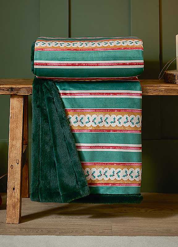 Wrap yourself in seasonal comfort with the All Wrapped Up Velvet Throw! Featuring jewel-toned festive stripes and a delicate holly motif, this luxurious throw pairs printed velvet with a cosy faux fur reverse and trim. Designed to keep you warm during the colder months, it adds a touch of elegance and charm to your home d©cor. Whether draped over your sofa or layered on your bed, it's a versatile winter essential perfect for creating a snug, stylish retreat.Soft velvet side and faux fur reverse add elegant style and cosy comfortFestive design features striped patterns with holly accents for seasonal charmDurable materials ensure long-lasting warmth and beauty through the colder monthsMachine washable at 30°C maxLow tumble dryDo not iron100% PolyesterSize approx. 130 x 180 cm