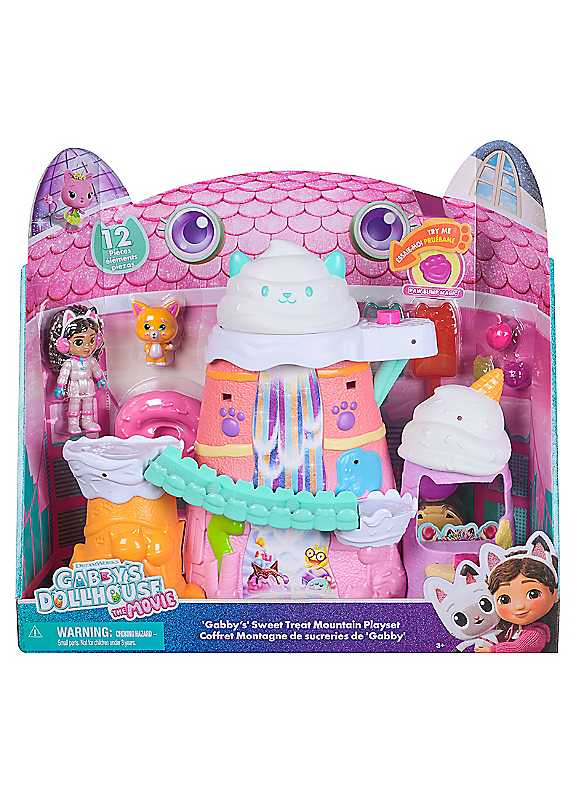 Bring home the magic of Gabby's Dollhouse: The Movie, with the Sweet Treat Mountain playset. With this playset, kids will explore Sweet Treat Mountain with a Gabby film figure, in her chilly sweet treat outfit, and her pal, Chumsley. This 12-piece playset is over 30cm wide and 25cm tall. Kids will love using peggable ice lollies to climb whipped cream mountain and uncover hidden activations, by pushing the Paw Bump Magic buttons, to reveal Cookie Bobby, or spin the whipped cream to reveal Chumsley's hideout. With a wobbly bridge and wobbly doughnut, the possibilities for play are endless.Unbox the Dollhouse Delivery, like Gabby does in the show, to find a surprise accessory, then scan the QR code to unlock a surprise in the Gabby's Dollhouse app. This set is a fun-filled way to invite meow-mazing explorations, with adorable Gabby cat toys for kids. Gabby's dollhouse toys are perfect gifts for kids to relive cherished moments from the Gabby movie, and for creating new adventures in Gabby's doll's house, with toddler toys and toys for girls like dollhouse accessories and furniture, her meow-mazing cat friends and mermaid toys, for endless hours of cat-terrific adventures (each sold separately).Age suitability: 3 years+Not suitable for children under 3 years old.