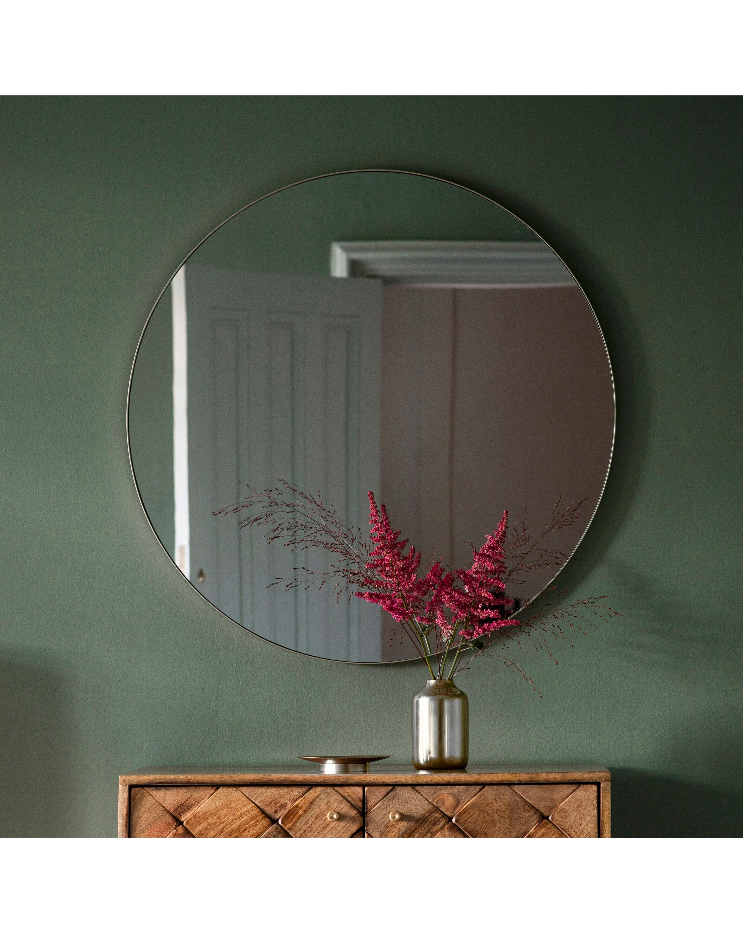Featuring a slim elegant silver metal frame, this round mirror is the perfect way to update your home. The contemporary shape and industrial inspired frame create a stunning statement piece. Wipe Clean. Wall Mounted. 2 x Sawtooth.