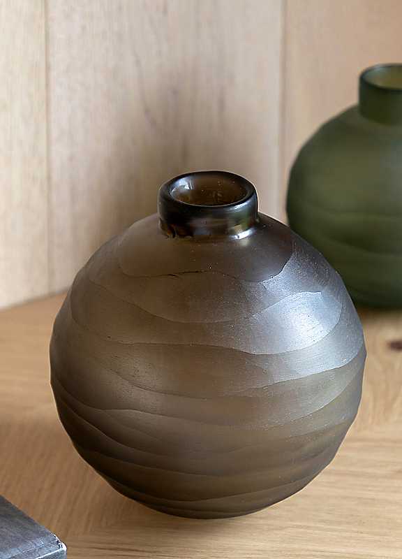 Flowing and organic, this stunning grey glass vase will add an artisanal element to a room. The hand-blown glass and hand-carved stripes create an effortless feel, perfect on its own or used as an eye-catching bud vase.GlassDimensions approx. 16 x 16 x 18 cm