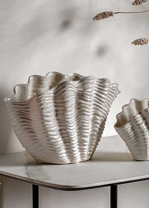 Bring the seaside to your room with this beautiful shell-shaped vase. In a white reactive glaze with fluted seashell details, this is the perfect way to display your flowers.StonewareDimensions approx. 37 x 16.5 x 22.5 cm