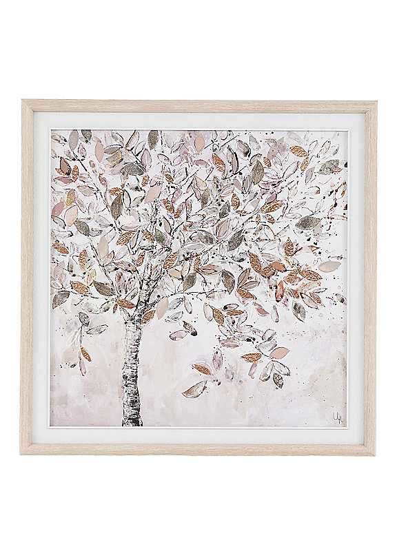 At the centre of this piece stands a graceful tree rendered in soft, natural tones, its leaves touched with shimmering copper and champagne metal foil. The metallic detailing brings warmth and light to the composition, evoking nature's shining brilliance.MDFDimensions approx. 830 x 40 x 860 mm | wood framed canvas, canvas wall art, framed canvas, nature canvas painting, leaf painting on canvas, tree canvas painting