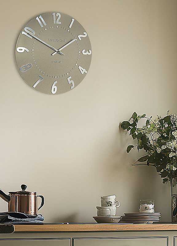 A shade of soft mocha adds an earthy, neutral tone to the Mulberry collection, creating a nurturing atmosphere to a modern interior. The warm beige hue covers the simple, open-faced, curvaceous dial, projecting a sense of calm. This contemporary wall clock features soft silver-foiled numerals and matching hands, which lend a glamorous touch to the versatile clock design.Metal, PlasticHeight approx. 12 in