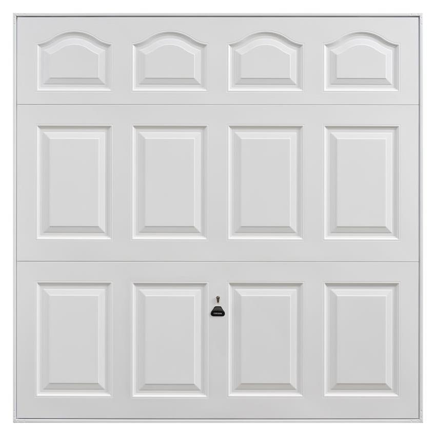 Garador Cathedral Panelled Frameless Canopy Garage Door - White - 2286 x 1981mm - Garador Up and Over Cathedral Garage Door in White are constructed around a galvanised steel box-section chassis, providing a boundary structure around which to build the door. Garage doors are manufactured with two galvanised steel braces which are spot welded to the inside, reinforcing the door leaf and ensuring a rigid door panel. Manufactured from high-grade galvanised steel, the closed “box section” chassis helps to ensure a strong and stable door construction. Frameless garage doors do not include a frame.