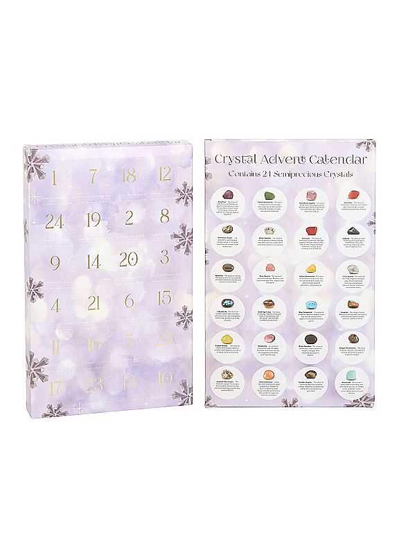 Count down the 24 days to Christmas with this mystical crystal advent calendar. Featuring 24 tumbled gemstones for spiritual healing and wellbeing, this calendar makes a special gift for the Christmas season. Stones include; amethyst, green aventurine, strawberry quartz, carnelian, dalmatian jasper, white howlite, red jasper, sodalite, hematite, rose quartz, yellow aventurine, clear quartz, labradorite, gold tiger's eye, blue turquenite, unakite, lemon quartz, rhodonite, black obsidian, dragon bloodstone, leopard skin jasper, gold sandstone, smokey quartz and amazonite. Size, shape and colour of stones will vary, making each crystal unique.