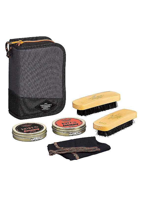 Buff up and shine with this smart Shoe Shine Kit. Includes two brushes, black and neutral polish (20g each) and a cleaning cloth, all stored together in a compact zipped grey fabric case with bright orange trim details - perfect to store at home or toss in luggage.Product size approx. 110Wx 170H x 65D mm