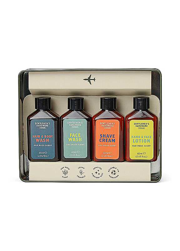 Equipped with 3-in-1 Wash, Shaving Cream, Face Wash, and Hand & Face Lotion, this compact kit has everything you need to look and feel your best. With vegan-friendly ingredients and an intoxicating Oak Moss scent, this kit makes the perfect gift or travel accessory, stored neatly in a reusable tin.3-in-1 Wash Directions: Apply generous amount to wet hair & body. Work into a lather & rinse off with water. For shaving, apply to wet skin, spread evenly & lather over beard. Shave. Rinse face & pat dryFace Wash Directions: Apply generous amount to wet face. Work into a lather & rinse off with waterShave Cream Directions: Apply to wet skin, spread evenly & lather over beard. Shave. Rinse face & pat dryHand & Face Lotion Directions: Massage gently onto skin. Apply as often as required