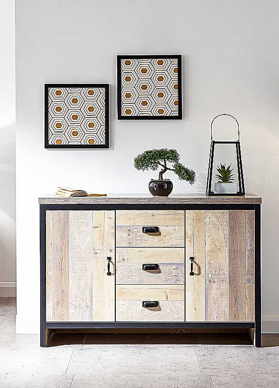 A sideboard can be a versatile a furnishing essential. Whether used to store dining accessories or given an updated role as a repository for home office essentials, this Boston sideboard is a bold contemporary design statement. The distressed urban finish in oak or grey is accentuated by the chunky construction with 30mm top panel. The symmetrical form incorporates a central column of drawers, flanked by a pair of cupboard doors. The industrial look is accentuated with black metal handles and wooden frame in contrasting dark grey.Suggested number of people for assembly: 2Tool kit included: YesSelf-AssemblyManufacturer's 1 year guaranteeWeight of Product: 39.6kgWall anchor kit included: YesWipe clean only, avoid household cleaners/abrasivesParticle BoardOverall assembled dimensions approx. 74.6H x 113W x 39D cmFloor to seat length approx. 9.5 cmPlease remember to measure your available space before ordering. If using on an un-carpeted floor we recommend rubber or felt protection pads be used under the legs to avoid damage to your floors.