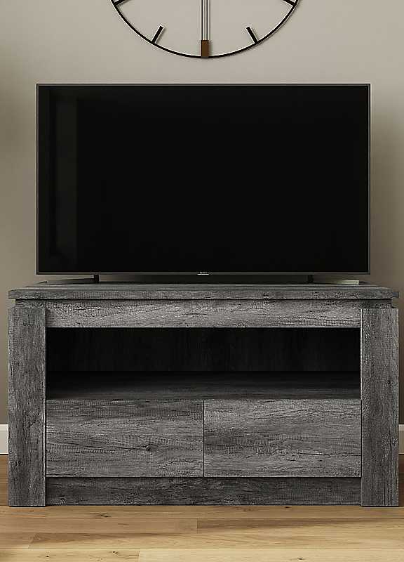 The Canyon 2 Drawer TV Unit is where functionality meets rustic design. Finished in a rich charcoal grey wood effect, this sturdy unit provides a stylish base for your TV and media setup. With a wide open shelf for consoles or decor and two deep drawers for hidden storage, it's ideal for keeping your living room neat and organised. The bold, textured look adds industrial flair, making it a standout piece in any modern or urban interior.Suggested number of people for assembly: 2Tool kit included: YesSelf-AssemblyManufacturer's 1 year guaranteeWeight of Product: 28.5kgWall anchor kit included: YesMax screen size: 40Wipe clean only, avoid household cleaners/abrasivesParticle BoardOverall assembled dimensions approx. 55H x 100W x 45D cmPlease Note: Delivery available to UK mainland only. Please remember to measure your available space before ordering. If using on an un-carpeted floor we recommend rubber or felt protection pads be used under the legs to avoid damage to your floors.