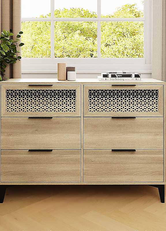 Bring function and flair to your bedroom with the Ezra 3+3 Drawer Chest in a warm oak finish. This eye-catching chest features six generous drawers-three on each side-ideal for storing clothes, accessories, or linens. The top drawers are enhanced with a unique laser-cut geometric pattern that adds texture and sophistication, while the black metal handles and tapered legs give it a sleek, modern edge.Crafted to blend seamlessly with minimalist or boho interiors, the Ezra chest makes a bold yet elegant statement. Whether placed in a master suite or guest room, this piece combines practical storage with distinctive design.Suggested number of people for assembly: 2Tool kit included: YesSelf-AssemblyManufacturer's 1 year guaranteeWeight of Product: 42.5kgWipe clean only, avoid household cleaners/abrasivesParticle Board, Legs: PlasticOverall assembled dimensions approx. 77H x 107W x 39D cmPlease Note: Delivery available to UK mainland only. Please remember to measure your available space before ordering. If using on an un-carpeted floor we recommend rubber or felt protection pads be used under the legs to avoid damage to your floors.
