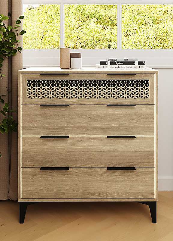 Add stylish functionality to your bedroom with the Ezra 4 Drawer Chest. Crafted in a contemporary oak finish, this chest features four spacious drawers perfect for organising clothing, accessories, or linens. The standout top drawer boasts a laser-cut geometric design, offering a unique decorative touch that blends beautifully with the minimalist profile and sleek black metal handles. Supported by sturdy black legs, the Ezra chest combines durability with eye-catching design, making it ideal for both modern and boho-inspired interiors.Suggested number of people for assembly: 2Tool kit included: YesSelf-AssemblyManufacturer's 1 year guaranteeWeight of Product: 32.95kgWall anchor kit included: YesWipe clean only, avoid household cleaners/abrasivesParticle Board, Legs: PlasticOverall assembled dimensions approx. 81.2H x 74.5W x 39D cmPlease Note: Delivery available to UK mainland only. Please remember to measure your available space before ordering. If using on an un-carpeted floor we recommend rubber or felt protection pads be used under the legs to avoid damage to your floors.