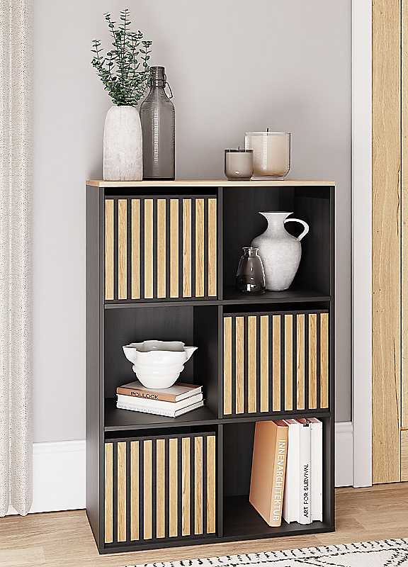 The Kube Storage Unit offers a sleek, modern design with a black finish and oak-effect slatted accents, bringing style and function to any space. Ideal for living rooms, hallways, bedrooms or offices, it features a mix of open shelves for display and hidden compartments for discreet storage. The textured detailing adds a contemporary edge, making it perfect for minimalist or industrial-inspired interiors. A versatile cube storage solution for keeping your space organised and stylish.Suggested number of people for assembly: 2Tool kit included: YesSelf-AssemblyManufacturer's 1 year guaranteeWeight of Product: 13.5kgWall anchor kit included: YesWipe clean only, avoid household cleaners/abrasivesParticle BoardOverall assembled dimensions approx. 89H x 60W x 28D cmPlease Note: Delivery available to UK mainland only. Please remember to measure your available space before ordering. If using on an un-carpeted floor we recommend rubber or felt protection pads be used under the legs to avoid damage to your floors.
