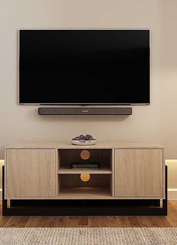Upgrade your living room with the perfect blend of modern design and everyday functionality. This 2 Door TV Unit features a warm oak finish paired with bold black frame, creating a clean, contemporary-inspired look. With spacious storage doors and central open shelves, it keeps media devices, remotes, and accessories organised while adding effortless style to your space. Designed with cable management in mind and soft-close doors for a seamless user experience, it's ideal for TVs up to 50 inches.Suggested number of people for assembly: 2Tool kit included: YesSelf-AssemblyManufacturer's 1 year guaranteeWeight of Product: 25.3kgMax screen size: 50Wipe clean only, avoid household cleaners/abrasivesParticle BoardOverall assembled dimensions approx. 52.5H x 124W x 39.5D cmPlease Note: Delivery available to UK mainland only. Please remember to measure your available space before ordering. If using on an un-carpeted floor we recommend rubber or felt protection pads be used under the legs to avoid damage to your floors.