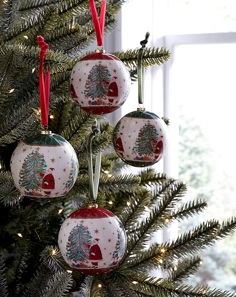 Capture the spirit of Christmas morning with these cheerful baubles featuring jolly Santa and trees.