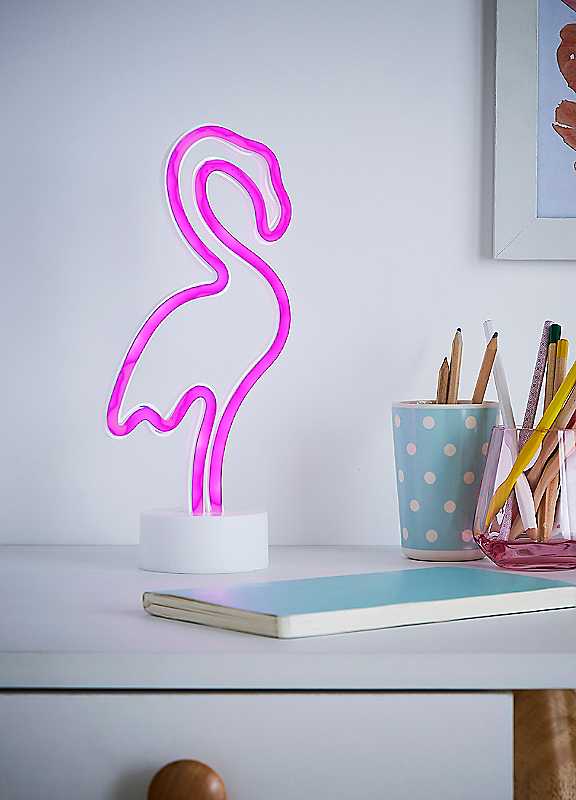 Bring a flash of tropical fun and vibrant colour into your space with the charming Flamingo Neon Light. This accent piece captures the iconic, elegant silhouette of the flamingo in a bright, captivating pink LED tubing.BatteryBulb Included LED 4 WattPlasticDimensions approx. 29.5H x 14W x 8.5D cm