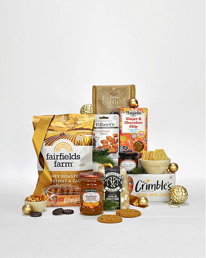 Celebrate the season with this thoughtful Gluten Free Christmas Box, packed with festive delights. Featuring cheese crackers, ginger & chocolate chip cookies, roasted peanuts, crisps, marmalade, panettone, chutney, and indulgent chocolates, it's the perfect balance of sweet and savoury. Specially curated for gluten-free enjoyment, this hamper ensures everyone can savour the joy of Christmas treats. Includes: Mr Filbert's Dry Roasted Peanuts (40g). Fairfields Farm Honey Roasted Chestnut & Sage flavoured Handcooked Potato Crisps (150g). Mrs Crimble's Gluten Free Original Cheese Crackers (130g). Mrs Darlington's Sweet Apple Chutney (120g). Arden & Amici Luxury Traditional Italian Classic Gluten Free Panettone in a Gift Box (100g). Mackays The Dundee Orange Marmalade made with Whole Fruit (340g). Mrs Crimble's Caramel Coconut Macaroons (x6). Angelic Ginger & Choc Chip Cookies (125g). Whitakers Luxury Dark Chocolate Creams with Coffee flavoured Fondant Centres (75g). Presented in a Star Design Gift Carton. Please note this is the transit carton and not packed in a separate box for shipping. On occasion, due to stock issues, we may have to substitute some of the items. We will Always substitute to another product that is equal or greater in both value and standard. The ingredients, allergens and nutritional values on this page are correct to the best of our knowledge, however, this can change without any prior notice. Always read the packaging before consuming. Please note we are unable to deliver this item ROI or Northern Ireland.