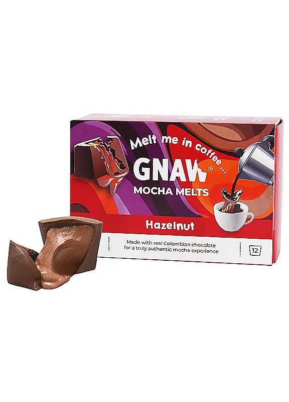 Gnaw Hazelnut Mocha Melts 240g A decadent treat designed to transform coffee into a luxurious mocha experience. Double chocolate with a gooey Hazelnut chocolate creme centreDrop one into hot coffee, stir, and enjoy a rich mocha-style hot drinkVelvety milk chocolate shell with a smooth, indulgent fillingNo palm oil, ethically sourced ingredients, vegetarian-friendly For ingredients information click here
