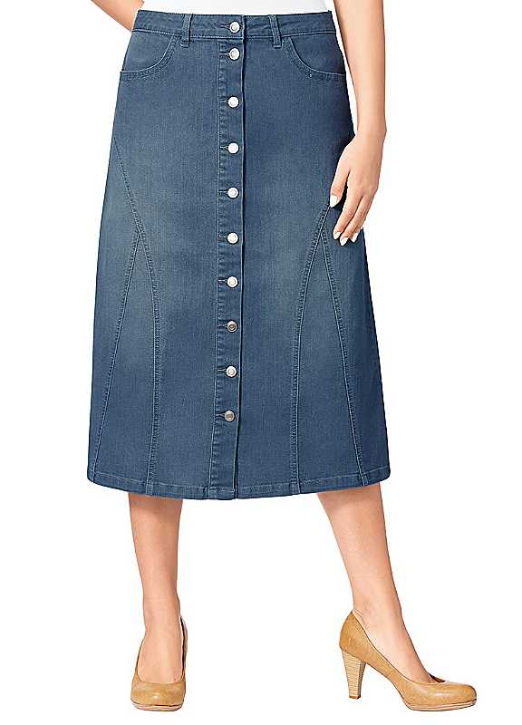 Denim skirt in a washed effect and slight A-line cut with Godet seam inserts and a tailored rear yoke. Features to two pockets on the side and two embroidered back pockets. With front, full-length button panel on which only the top and bottom buttons can be opened. Belt loops Washable 79% Cotton, 19% Polyester, 2% Elastane Petite length approx. 72 cm (28¾ in) Regular length approx. 76 cm (30¼ in)