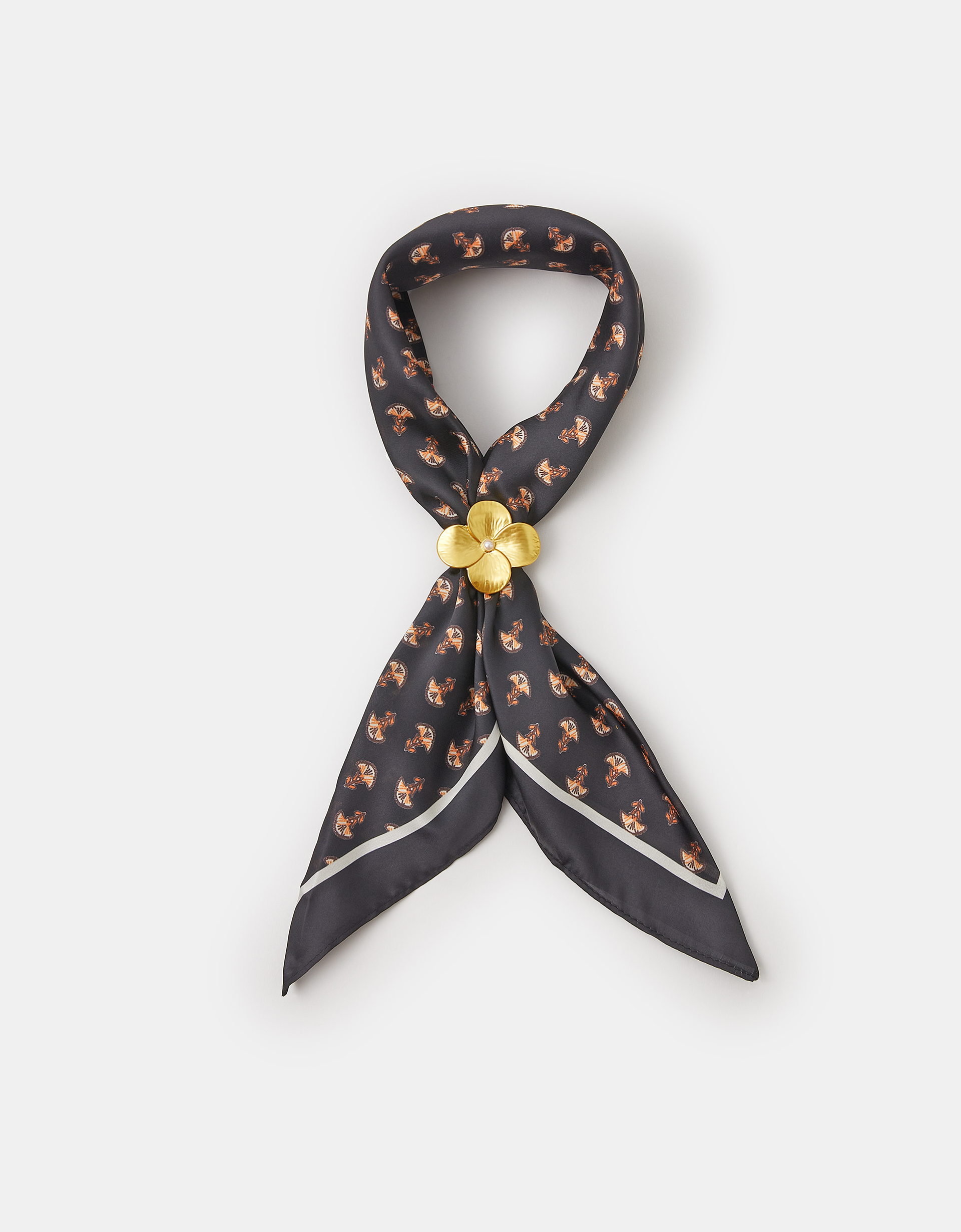 Outfit feeling a little flat? Cue the neckerchief. The ultimate styling hack for the new season, the satin scarf is patterned with decorative motifs whilst the gold-tone flower ring ties it in place front and centre.