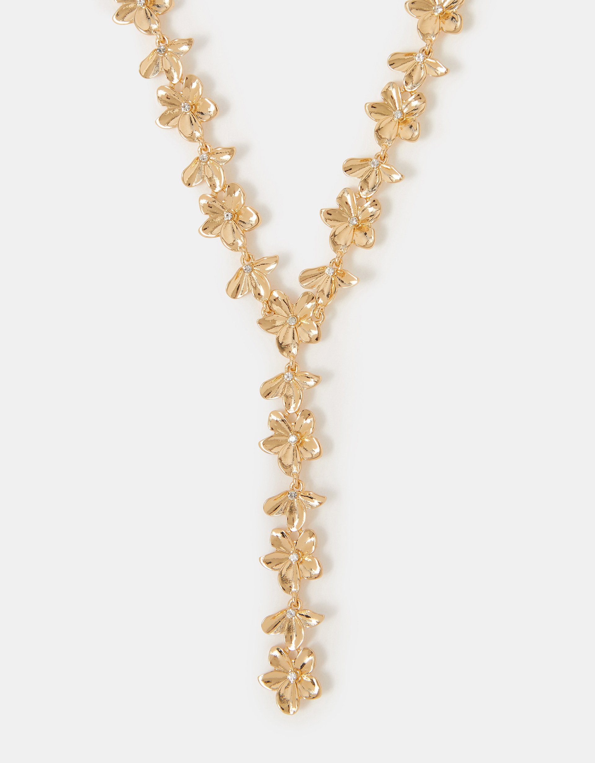 Oh, hello you! Take your v-neck tops and strappy dresses to the next level with this Y-shaped necklace. Adorned with golden flowers and sparkly stones, it's complete with a lobster clasp and extender.