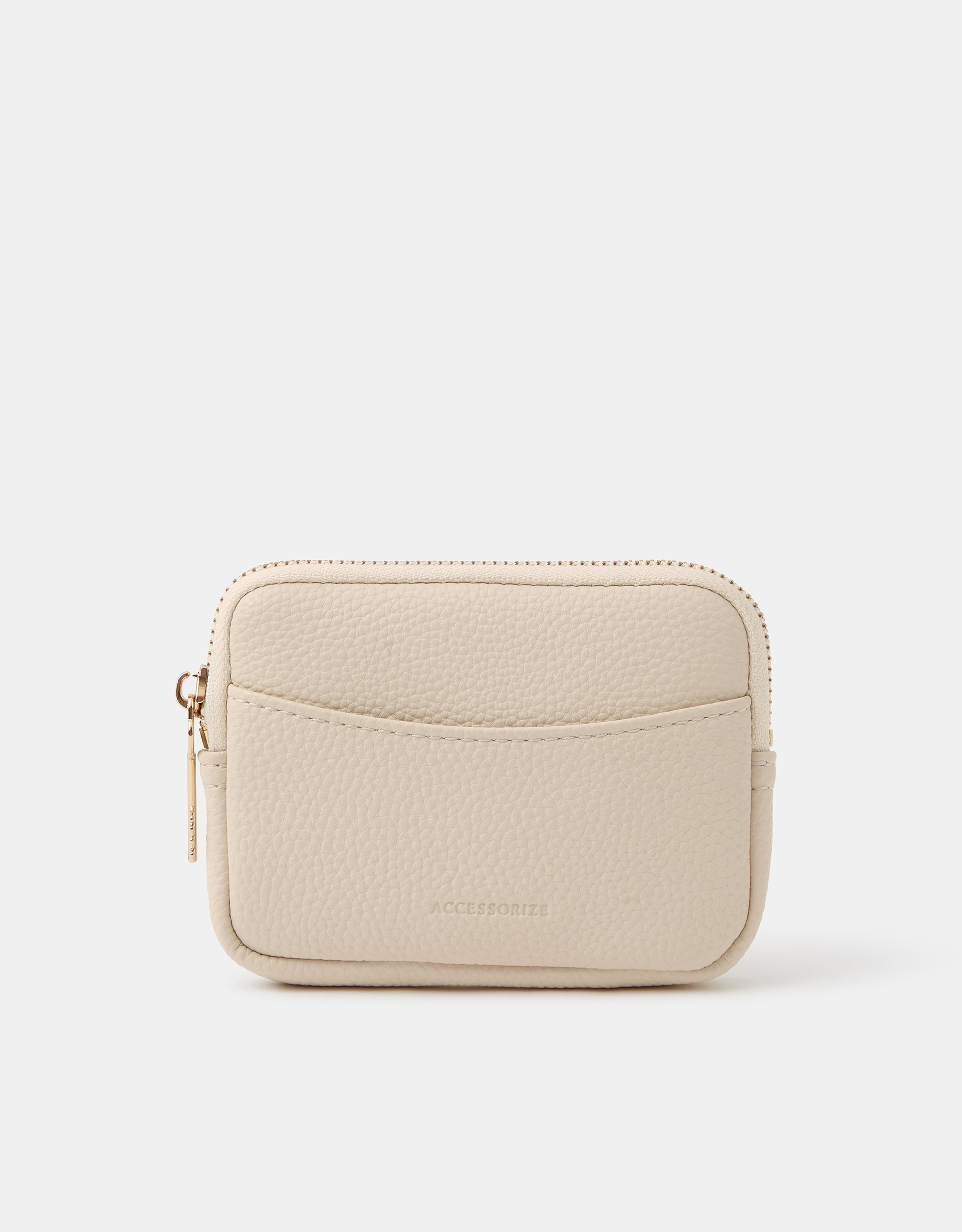 Crafted of faux leather with a pebbled finish, this plain coin purse is a must-have for your spare change. Chic and compact, it features an outer slip pocket and fastens with a key charm zip in a golden tone.
