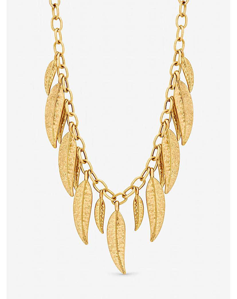 Mood Gold Plated Leaf Necklace Our Mood Gold Plated Leaf Necklace is a must have this season, featuring delicately crafted leaf charms, this necklace captures the beauty and simplicity of nature in a timeless design. Fastening: Lobster clasp Material: Gold plated base metal Chain length: 16. Width: 410mm, length: 410mm. "