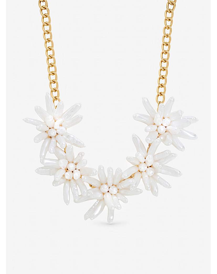 Mood Statement Pearl Floral Neckalce Our Mood Statement Pearl Floral Necklace is made to elevate your look, designed with a captivating blend of elegance and artistry. Featuring beautifully crafted floral and lustrous pearls, this necklace makes a striking statement while maintaining a timeless, sophisticated charm. Fastening: Lobster clasp Material: Gold plated base metal Chain length: 16, extender length: 2". Width: 410mm, length: 410mm. "