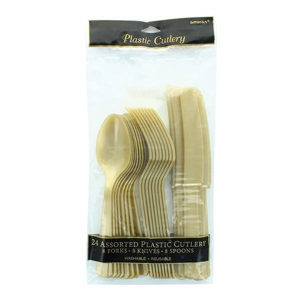 This pack of 6 gold plastic cutlery set includes a knife, fork and spoon for use with party food.