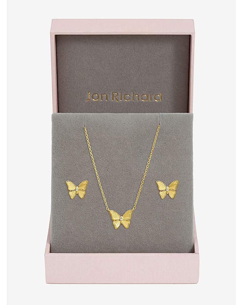 Jon Richard Gold Plated Diamond Cut Butterfly Set - Gift Box The Jon Richard Gold Plated Diamond Cut Butterfly Set embodies transformation and grace. Its diamond-cut wings glisten with the promise of freedom, beauty, and renewal. Beautifully presented in a reusable gift box. Fastening: Lobster clasp, post and bullet back Material: Gold plated base metal Chain length: 16, extender length: 2". Width: 20mm, length: 20mm. Non-returnable: in the interest of hygiene we are unable to exchange or refund this item unless faulty, this does not affect your statutory rights. Comes in gift box "