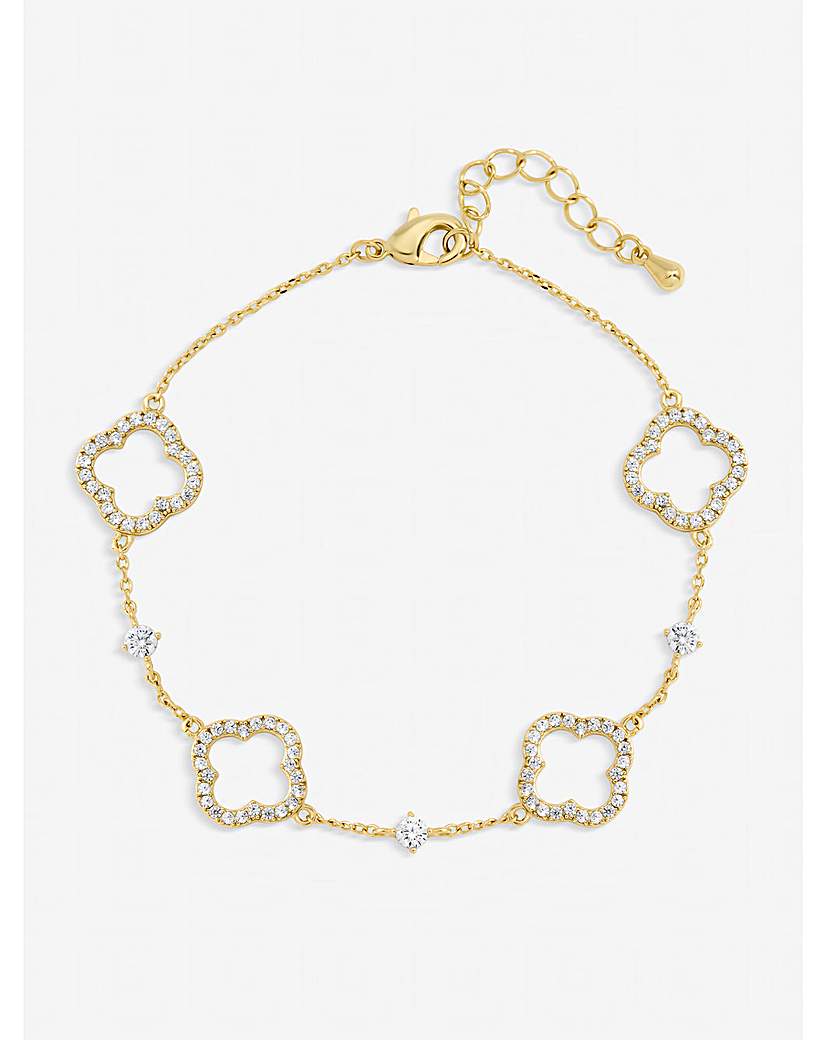 Jon Richard Gold Plated Pave and Crystal Open Clover Bracelet The Jon Richard Gold Plated Pave and Crystal Open Clover Bracelet is a sparkling and sophisticated addition to any jewellery collection. Featuring delicate open clover motifs adorned with pave crystals along polished gold plating, it catches the light beautifully from every angle. Perfect for both day and evening wear, this bracelet adds refined elegance and timeless glamour to the wrist. Fastening: Lobster clasp Material: Gold plated base metal Chain length: 7, extender length: 2". Width: 15mm, length: 15mm. "