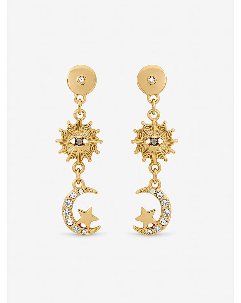 Mood Gold Plated Evil Eye Celestial Earrings Our Mood Gold Plated Evil Eye Celestial Earrings are a must have this season! Crafted with a luminous gold-plated finish, this piece features a delicately detailed evil eye motif paired with celestial accents that shimmer with every movement. Fastening: Post and bullet back Material: Gold plated base metal Width: 20mm, length: 20mm. Non-returnable: in the interest of hygiene we are unable to exchange or refund this item unless faulty, this does not affect your statutory rights.