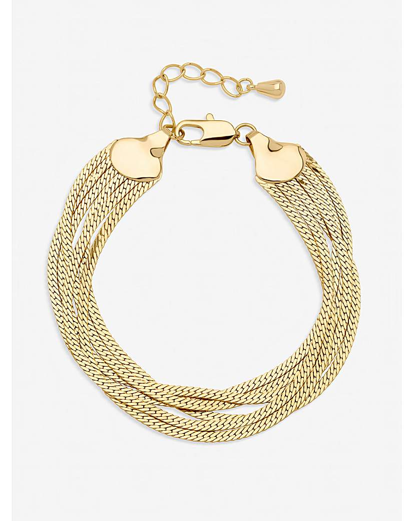 Inicio Gold Plated Multi Layered Bracelet - Gift Pouch Our Inicio Gold Plated Multi Layered Bracelet is designed to make a statement crafted with chains layered at varying lengths, it creates a chic, dimensional look that effortlessly elevates any outfit. Fastening: Lobster clasp Material: Gold plated base metal Chain length: 7, extender length: 2". Width: 210mm, length: 210mm. Comes in gift pouch "