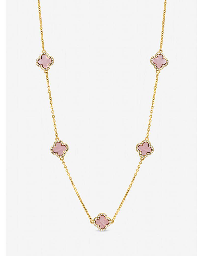 Jon Richard Gold Plated and Pink Station Clover Necklace The Jon Richard Gold Plated Pink Station Clover Necklace is a vibrant and sophisticated addition to any jewellery collection. Featuring polished gold plated clover motifs in a soft pink hue, spaced along a delicate chain, it catches the light beautifully from every angle. Perfect for both day and evening wear, this necklace adds refined elegance and a playful pop of colour to the neckline. Fastening: Lobster clasp Material: Gold plated base metal Chain length: 16, extender length: 2". Width: 10mm, length: 10mm. "
