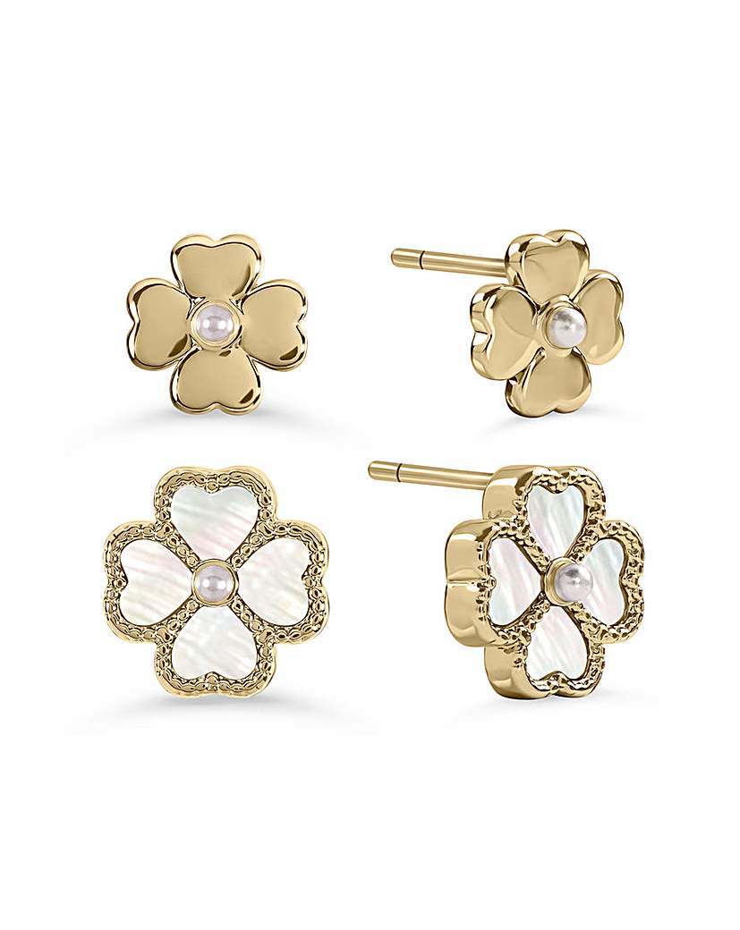 Radley Gold Plated MOP Heart earrings Radley 18ct Gold Plated Mother of Pearl Heart Flower Twinpack Earrings. This Radley twinpack features two elegant pairs of heart-shaped flower earrings, each with its own unique charm. One pair is crafted in polished 18ct gold plating with smooth heart petals and a luminous white glass pearl at the centre for a timeless, feminine look. The second pair brings a softer, iridescent finish with heart-shaped petals edged in a delicate bobble design, filled with genuine mother of pearl and completed with a central white glass pearl. 18ct Gold Plated Presented in Official Radley Packaging. Dimensions: 7.1 x 7.2 x 2.48
