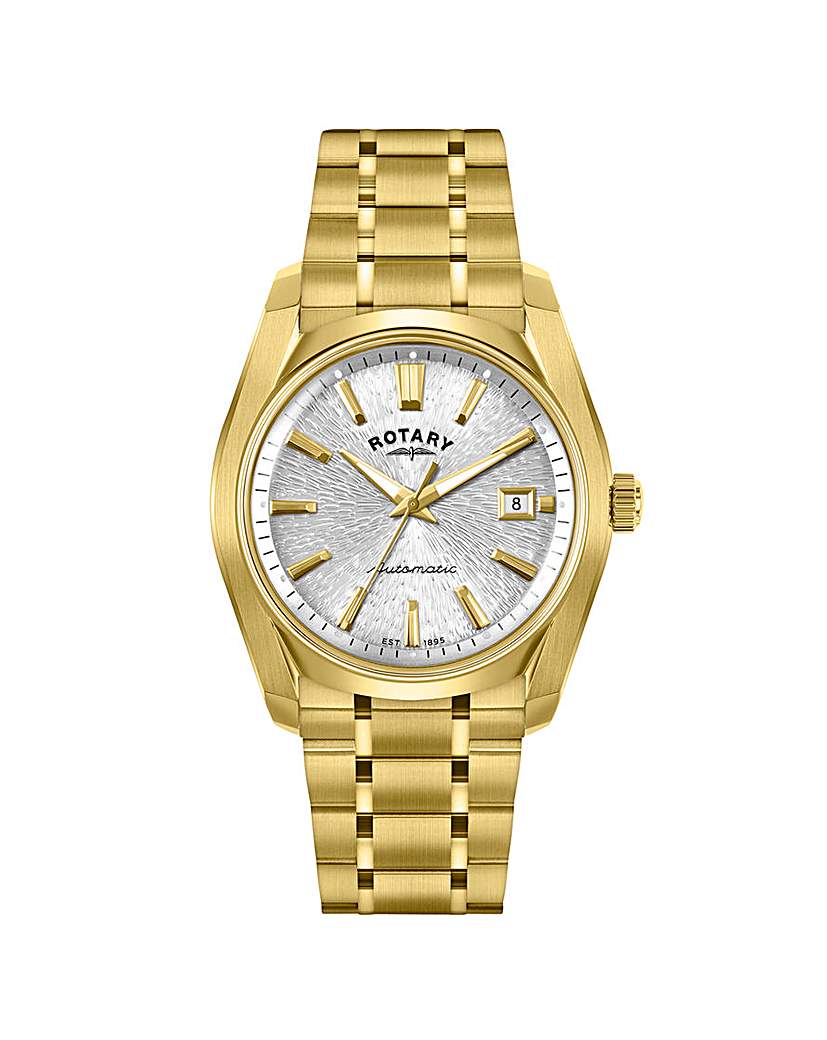 Rotary Men Gold Plated Bracelet Watch The Rotary Lumen reimagines the sports watch blueprint. Its 40mm gold PVD case features angular edges and sharp lugs tapering down to a multi-polished 3-link bracelet.With a lug to lug of 47mm, the Lumen feels well balanced on the wrist, staying true to its contemporary proportions. The case gently tapers up, revealing a bubble mineral crystal, giving a vintage touch and effortlessly blending into the contours of the case. At the heart of the watch is the reliable Miyota 8215 calibre automatic movement, offering a 42-hour power reserve and 50M water resistance for everyday versatility. Turning the watch over reveals an exhibition caseback, allowing for a glimpse into the inner workings. The centrepiece of the watch is the dial, with a unique, stone-like shimmer that shifts with the light, adding depth and sophistication to every glance. The Rotary Lumen takes inspiration from nature, delivering a crisp white dial that captures the gleam of new fallen snow. Gold Stainless Steel Bracelet Presented In Official Rotary Packaging Dimensions: 21 x 4 x 1.3