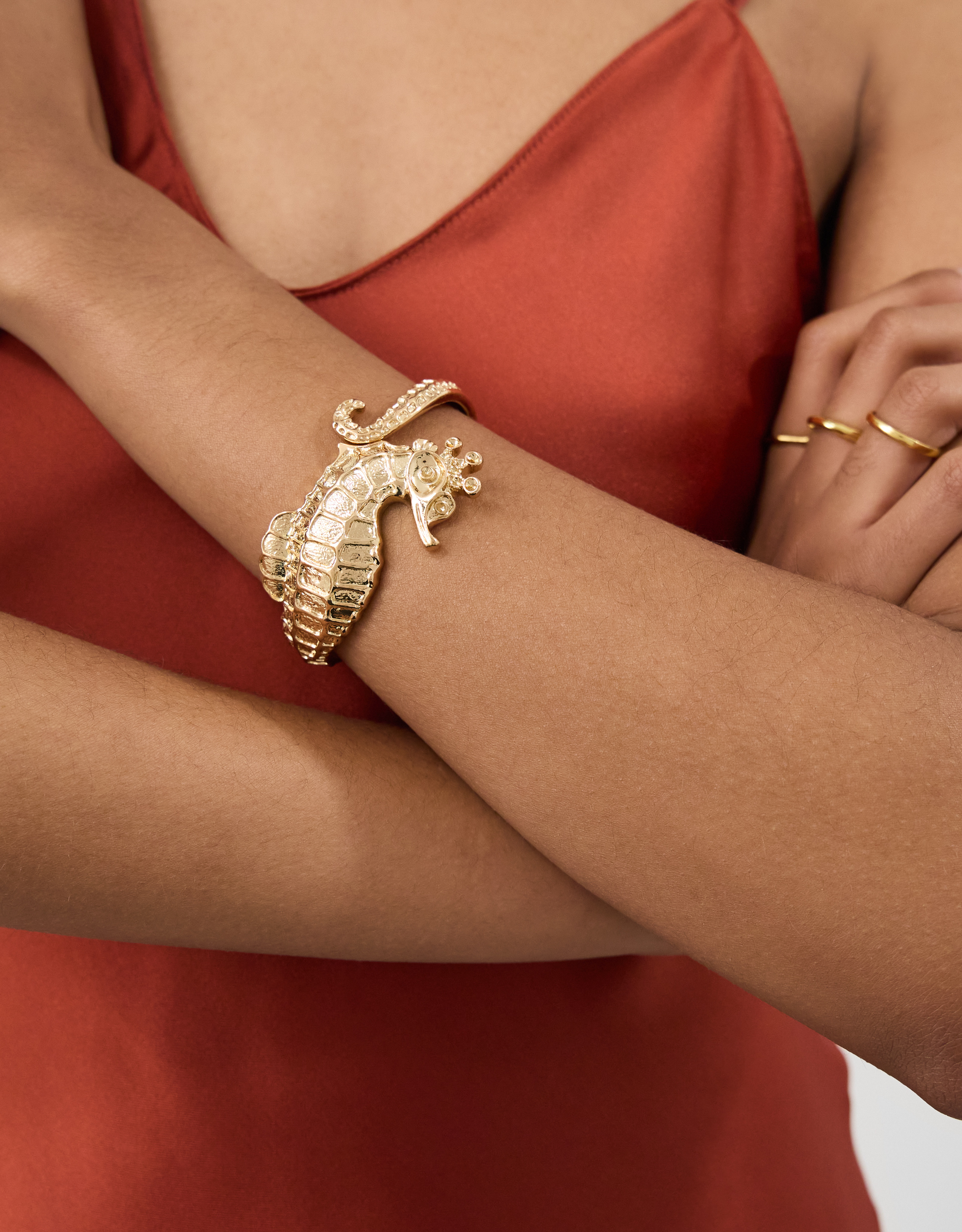 Dipped in a golden tone, this bracelet showcases a friendly seahorse, bringing coastal glam to your evening looks. Complete with a hinge detail, it's comfy and stylish.