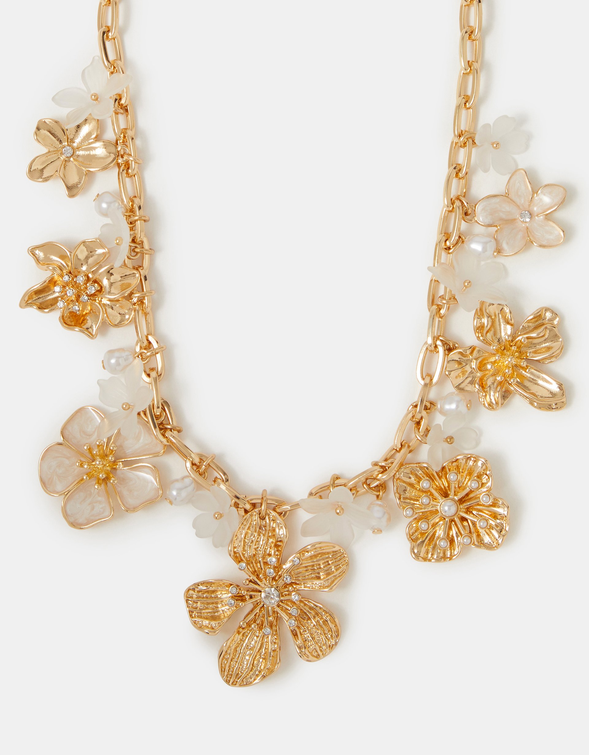 Supersized jewels: in. Crafted with standout flowers in golden and pearl finishes, this necklace will turn heads instantly. While stacking has been your recent go-to, this one was born to be styled solo. Pretty, right?