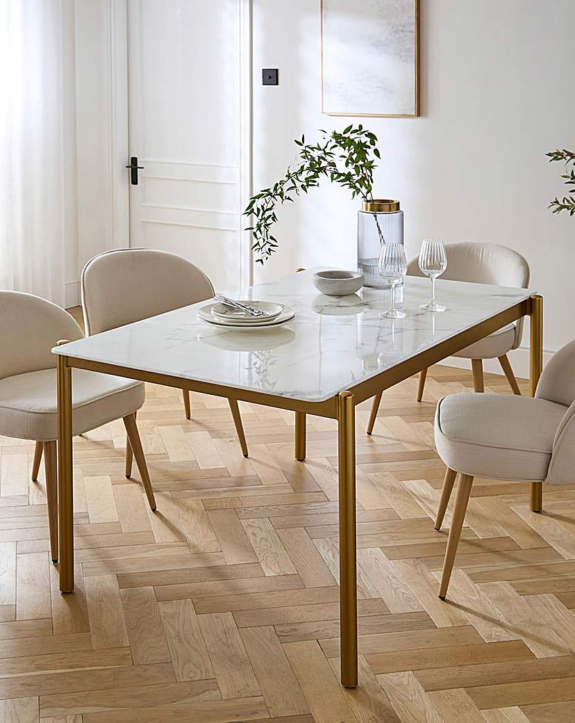 The Thea dining table has a marble effect glass top, with metal legs. Self assembly required.
