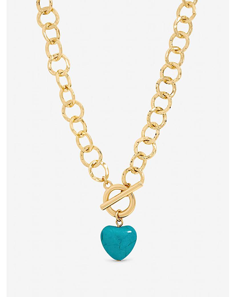Mood Gold Plated and Turquoise Heart T-Bar Necklace Our Mood Gold Plated and Turquoise Heart T Bar Necklace is a must have this season, This stylish piece features a polished gold-plated chain paired with a vibrant turquoise heart pendant, creating a perfect balance of playful detail and refined elegance. Fastening: T-Bar Material: Gold plated base metal Chain length: 18. Width: 25mm, length: 25mm. "