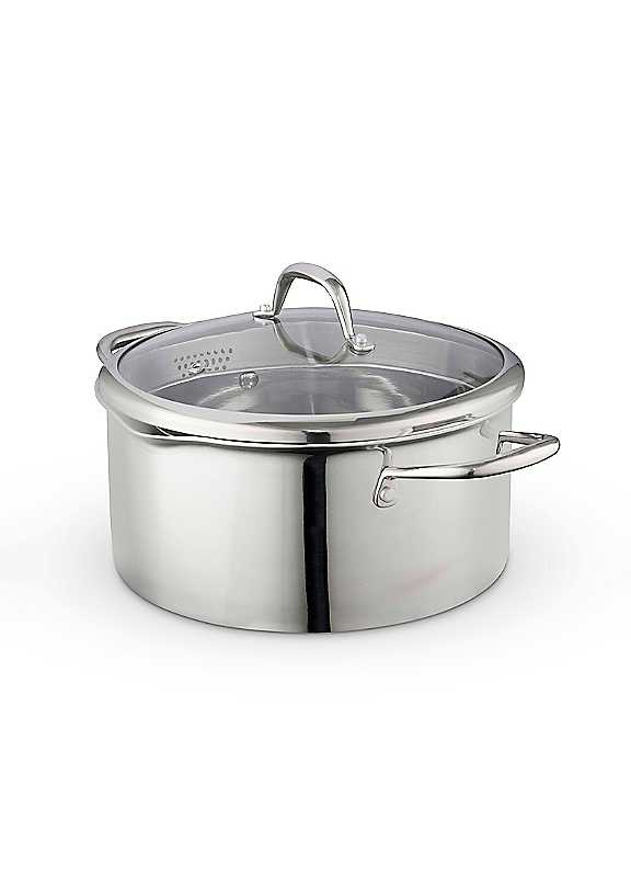 Get the most out of your kitchen with this 24cm Casserole Dish from Good Food in partnership with Tower. Specially designed to be used with the vast Good Food recipe library, the dish offers simple serving with pouring lips and a tempered glass lid. Crafted from 2.5mm tri-ply stainless steel, the dish offers rapid heat and even heat distribution for more thorough cooking with no heat spots, whilst a riveted steel handle offers comfort and easy manoeuvrability. The satin interior and mirror exterior offer a more professional look that enhances any kitchen. The dish is oven safe up to 220°C, whilst the three layer bonded base allows for use on any hob type including induction for greater cooking versatility. The lid has dual sized straining holes that allow for easy serving, removing the water to avoid spillages. It is dishwasher safe for simple and fuss free cleaning, although handwash is recommended to maintain the finish.Made from high quality 2.5mm triply stainless steelStraight body with satin finish interior & mirror finish exteriorTempered glass lid with steam release ventRiveted cast steel handle & inner capacity markingsBuilt for long lasting strength & durabilityOven safe up to 220 degrees CelsiusQuick & even heat distributionSuitable for all hob types including inductionPackaging type: Colour gift boxDishwasher safe - hand wash recommended