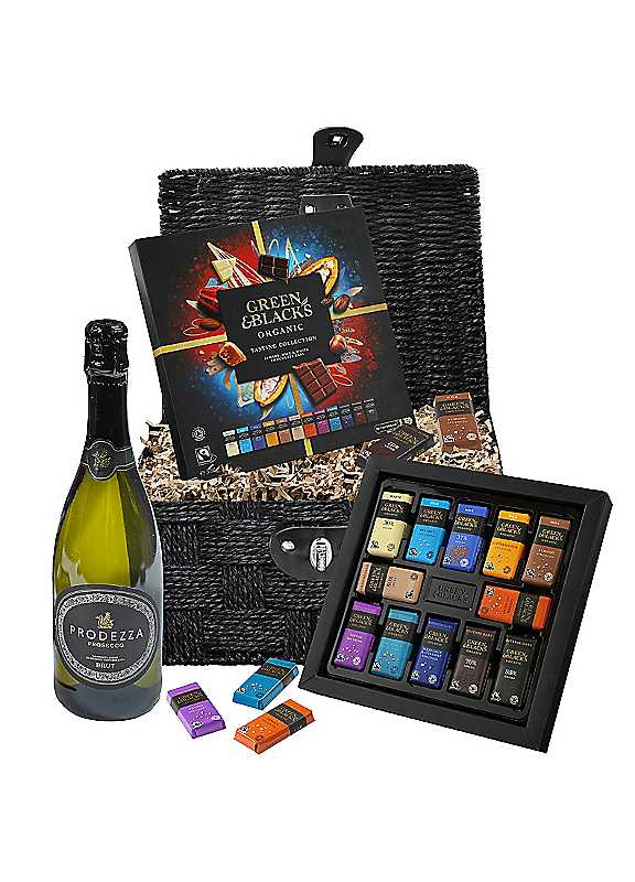 Green & Blacks Organic Miniature Chocolate Bar Tasting Collection and a bottle of Prodezza Prosecco Brut delivered in an attractive presentation 14' basket. The iconic Organic chocolate Tasting collection contains a delicious selection of dark, milk and white chocolate. 1 x Green & Black's Organic Tasting Collection 360g 1 x 75cl Prodezza Prosecco Brut - Italian ABV. 11%For ingredients information click here