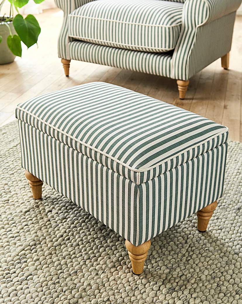 The Naomi Storage Footstool is upholstered in a stripe fabric. The top of the footstool can be removed to reveal storage space. Self assembly required.