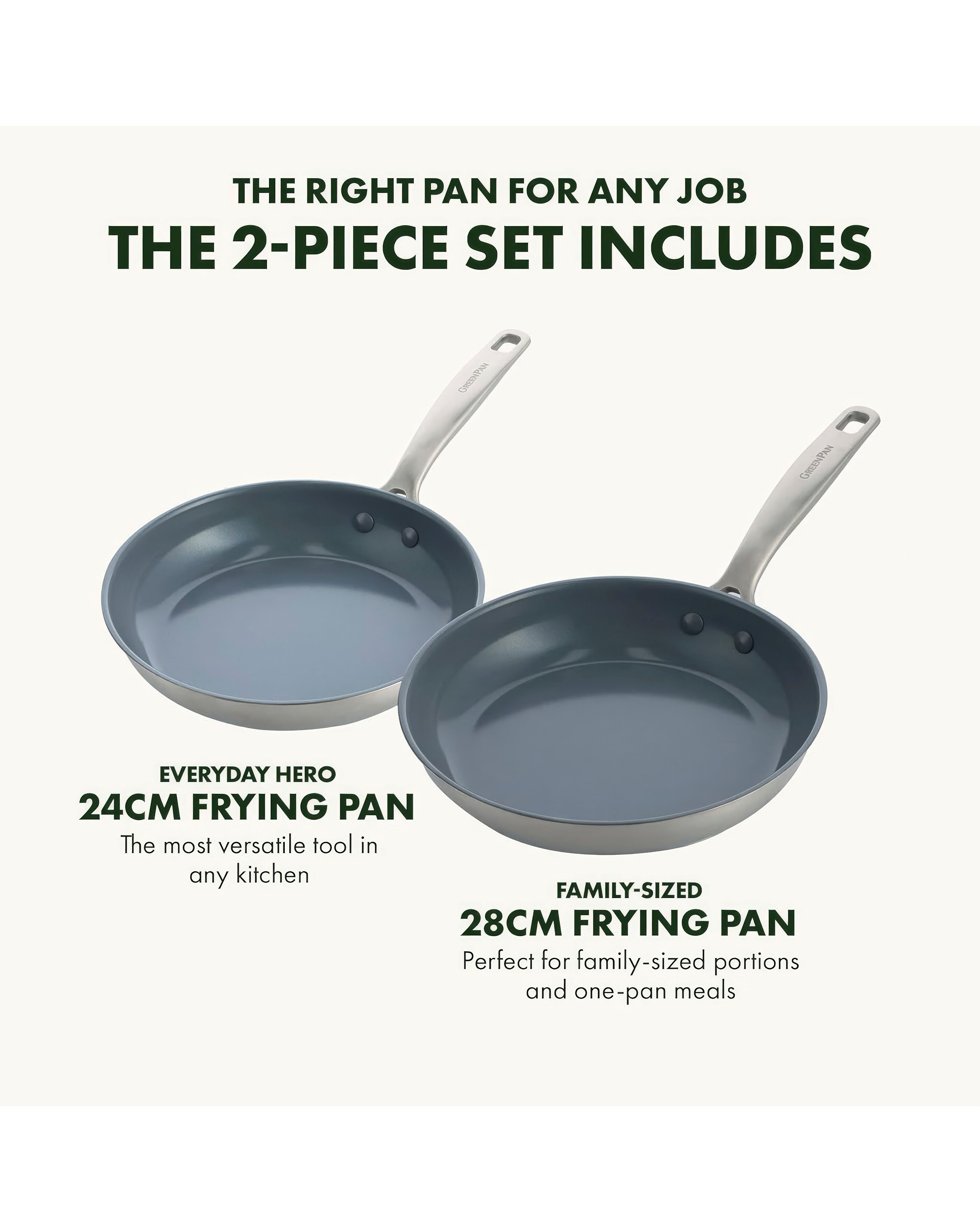 Enhance your cooking experience using this Frying Pan Set from the GreenPan Treviso collection. Perfect for daily use, the durable stainless-steel construction ensures excellent heat distribution for even cooking results! Embrace a healthier lifestyle thanks to the ceramic non-stick coating, ensuring that your ingredients slide smoothly out of your pan using less oil. Perfect for hob-to-oven cooking, this pan set is oven safe up to 315 Degrees Celsius and compatible with all stove types including induction.