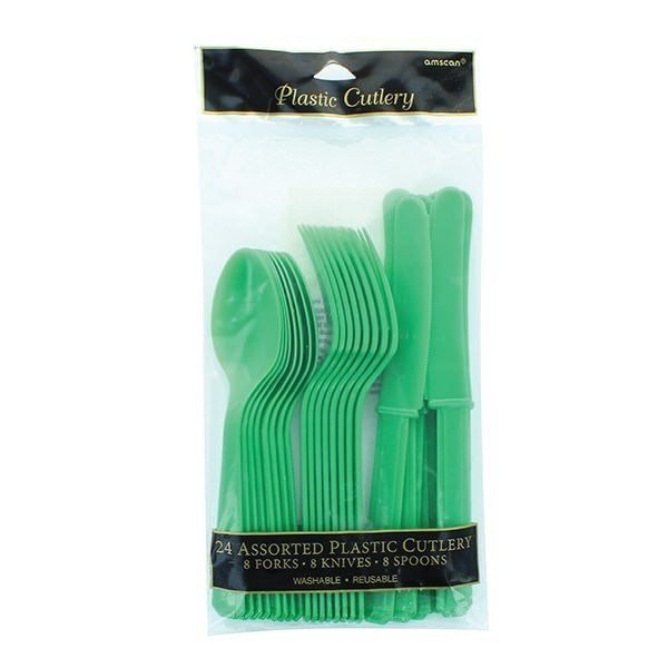 This pack of 6 green plastic cutlery set includes a knife, fork and spoon for use with party food.