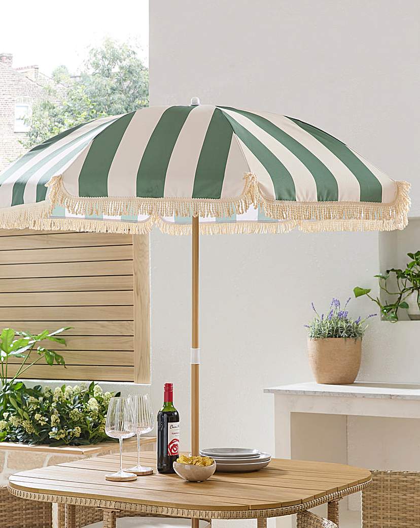 Stripe Fringed Parasol features: Green and white strips with tassels. Wooden effect parasol pole. Supplied self-assembled. 12 Month manufacturers warranty.