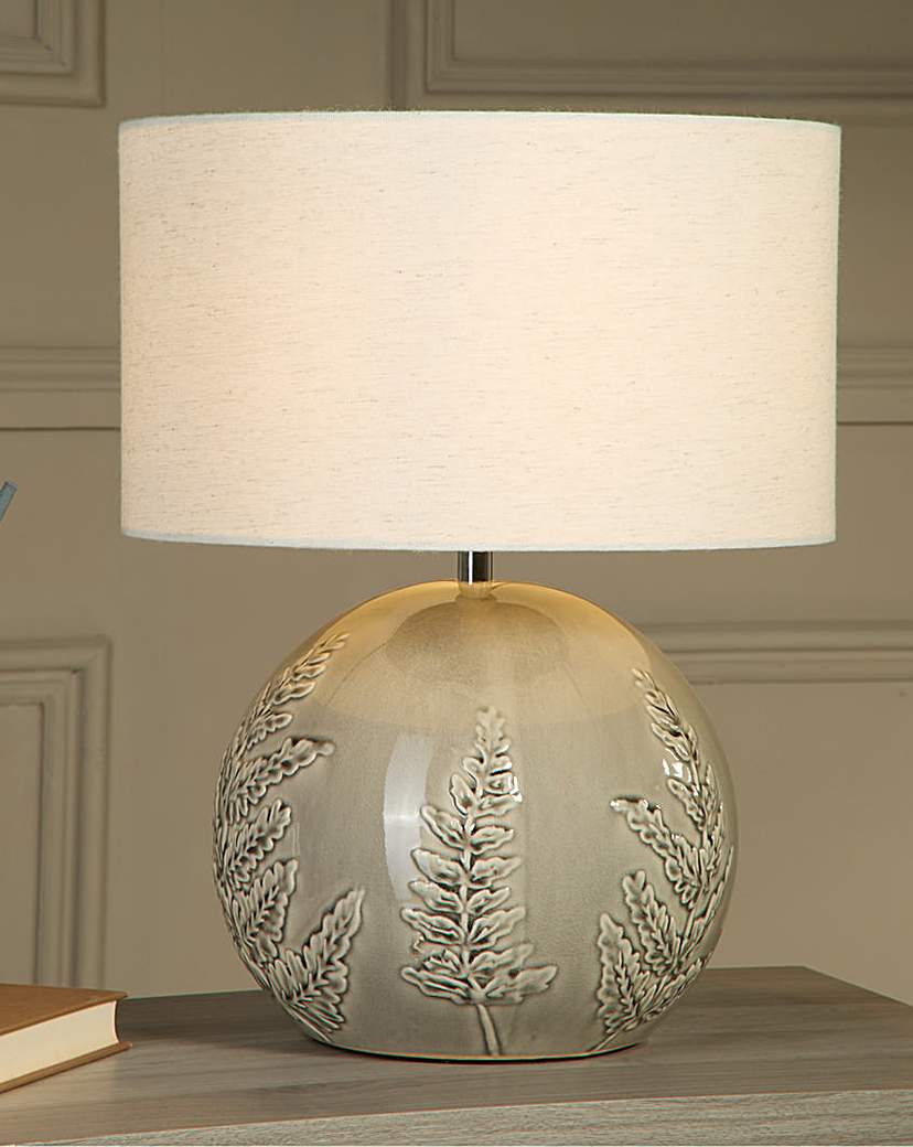 Ceramic Leaf Emboss Table Lamp. Textured Botanical Base, Matte Ceramic Finish, Neutral Colour Palette, Wide Drum Lampshade, Inline Switch, Cable length: 180cm, Light bulb type recommendation: E14 Golf Ball LED 10W