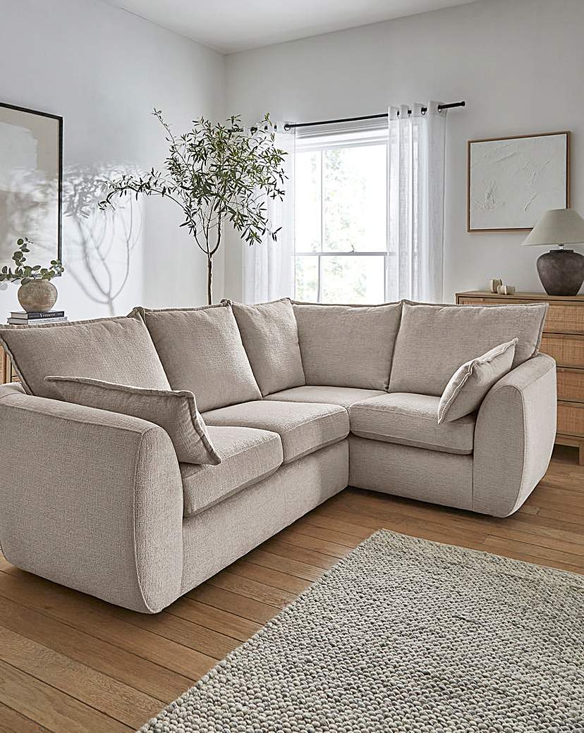 Finch Left Hand Corner Sofa. Contemporary style, Square outer arms, Pillow back with accent cushions. Ready Assembled