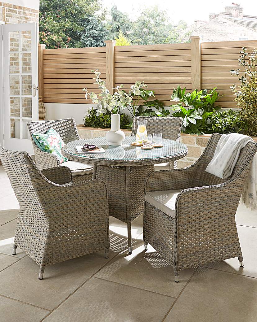 The Ravello Four Seater Dining Set includes four ergonomically designed dining chairs and a spacious round table, perfect for family meals and entertaining guests. Made of strong and durable materials, this design can stand the test of various factors, ensuring that it will remain a beautiful feature in your garden for years to come. 2 Year manufacturer warranty.